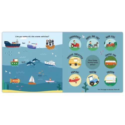 Slide the spotlight pages and reveal over 60 colourful vehicles—from race cars to aeroplanes. Designed to build visual recognition and early vocabulary through interactive discovery and vibrant art.